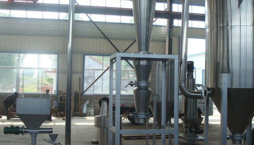 气流粉碎机是一种利用高速气流实现干试材料超微粉的机器,由气流粉碎机实现、旋风收集器、除尘器、引风机、电气控制柜等组成。压缩空气经过过滤、干燥和脱脂后,通过特殊配置的喷嘴高速喷入粉碎腔,在高压气流的作用下粉碎物料。粉碎后的物料随着气流上升进入分级腔。